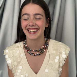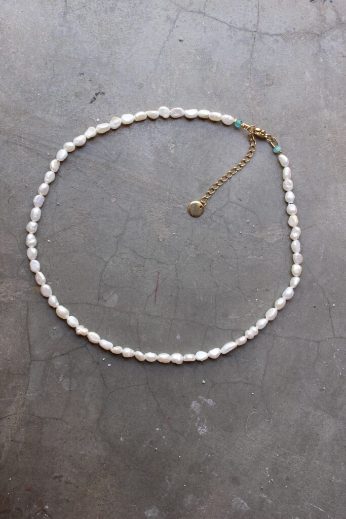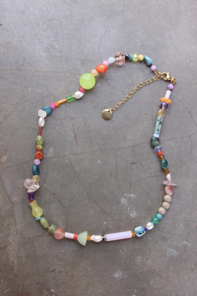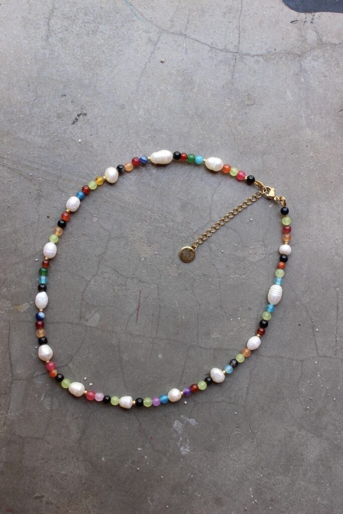 El collar de piedras naturales y perlas, que nos acompaña desde la primera colección. Un básico eterno y nuestro rey de ventas sencillo, versátil y lleno de energía.