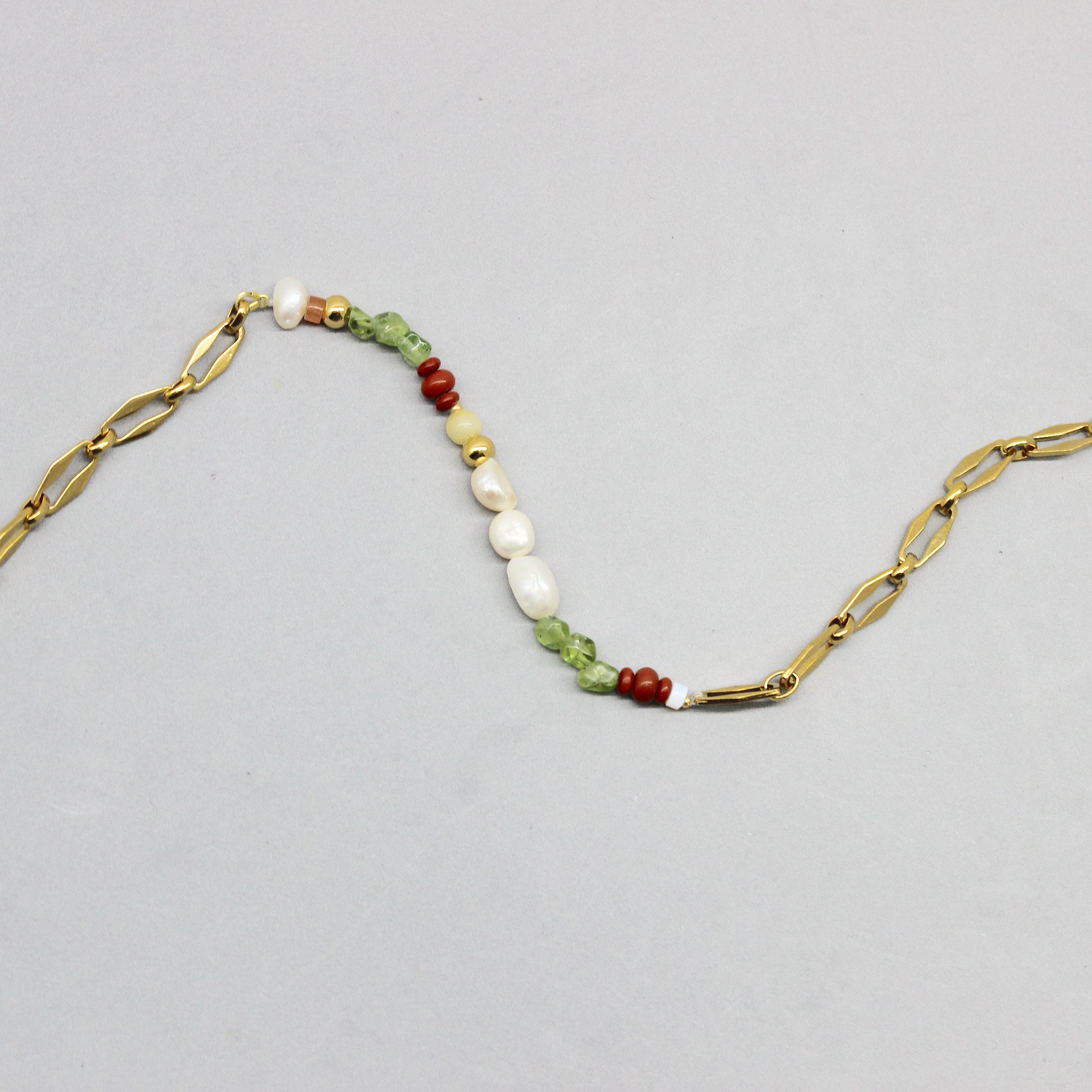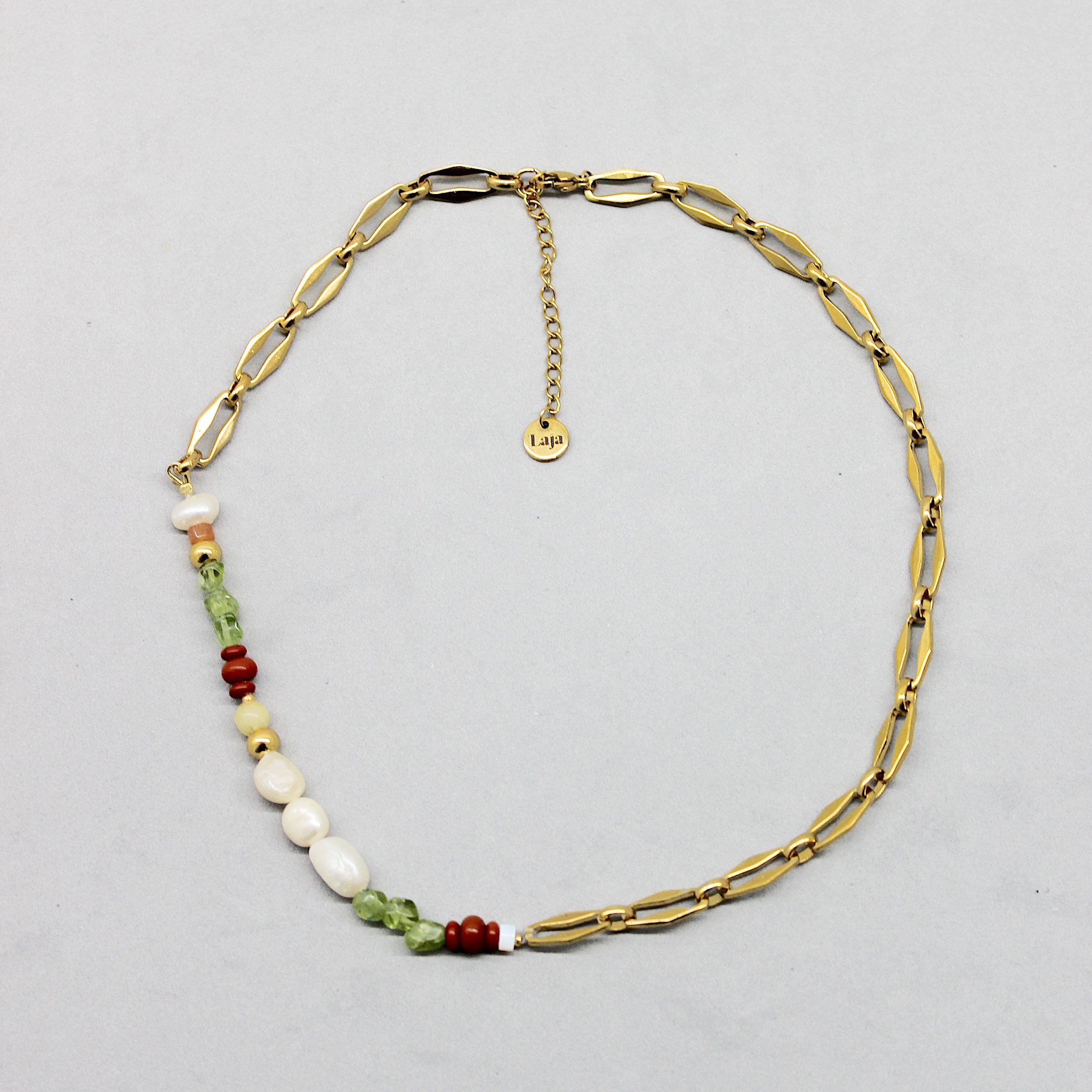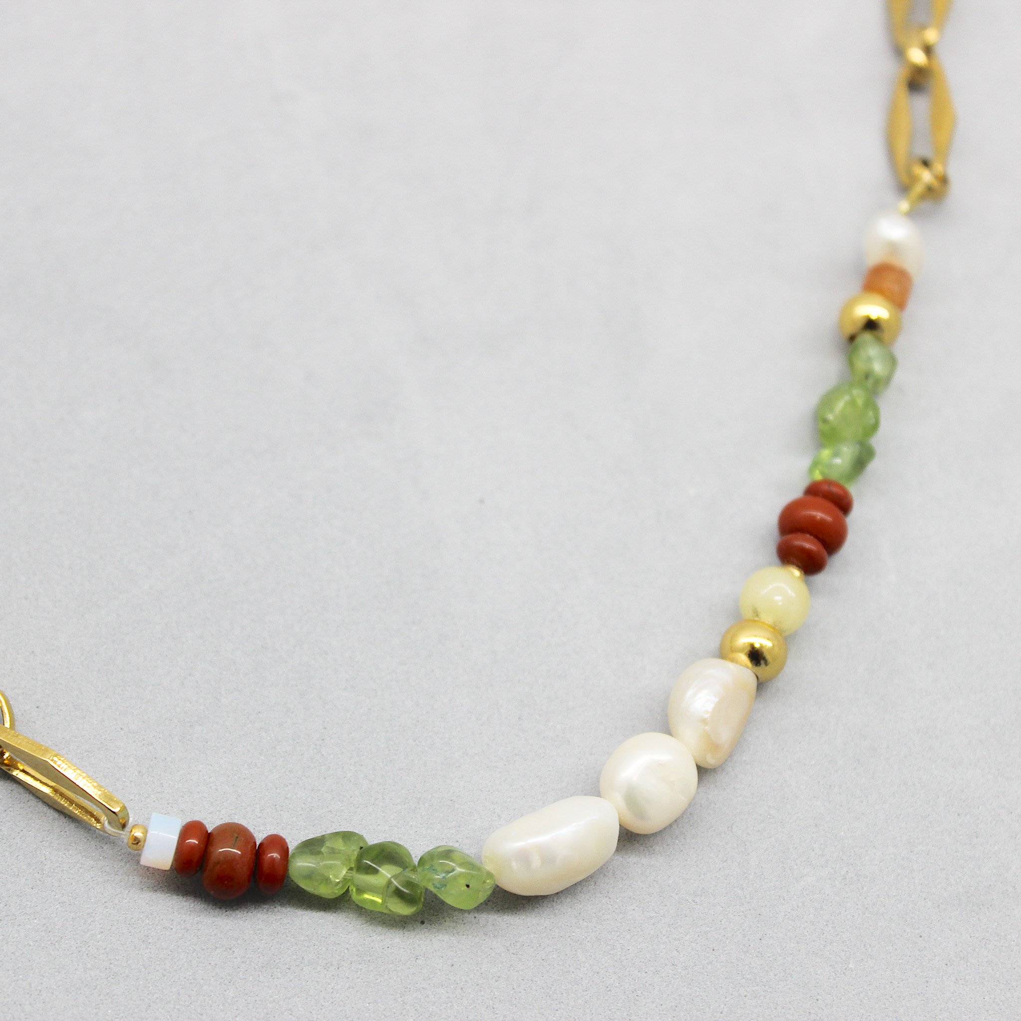 Collar de 40cm con cadena de acero inoxidable, piedras semipreciosas, perlas cultivadas de agua dulce y alargador de 5 cm
