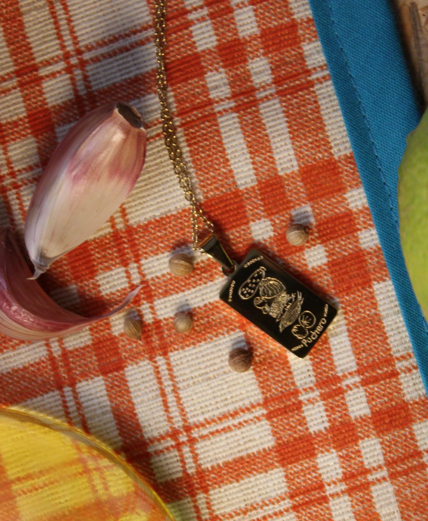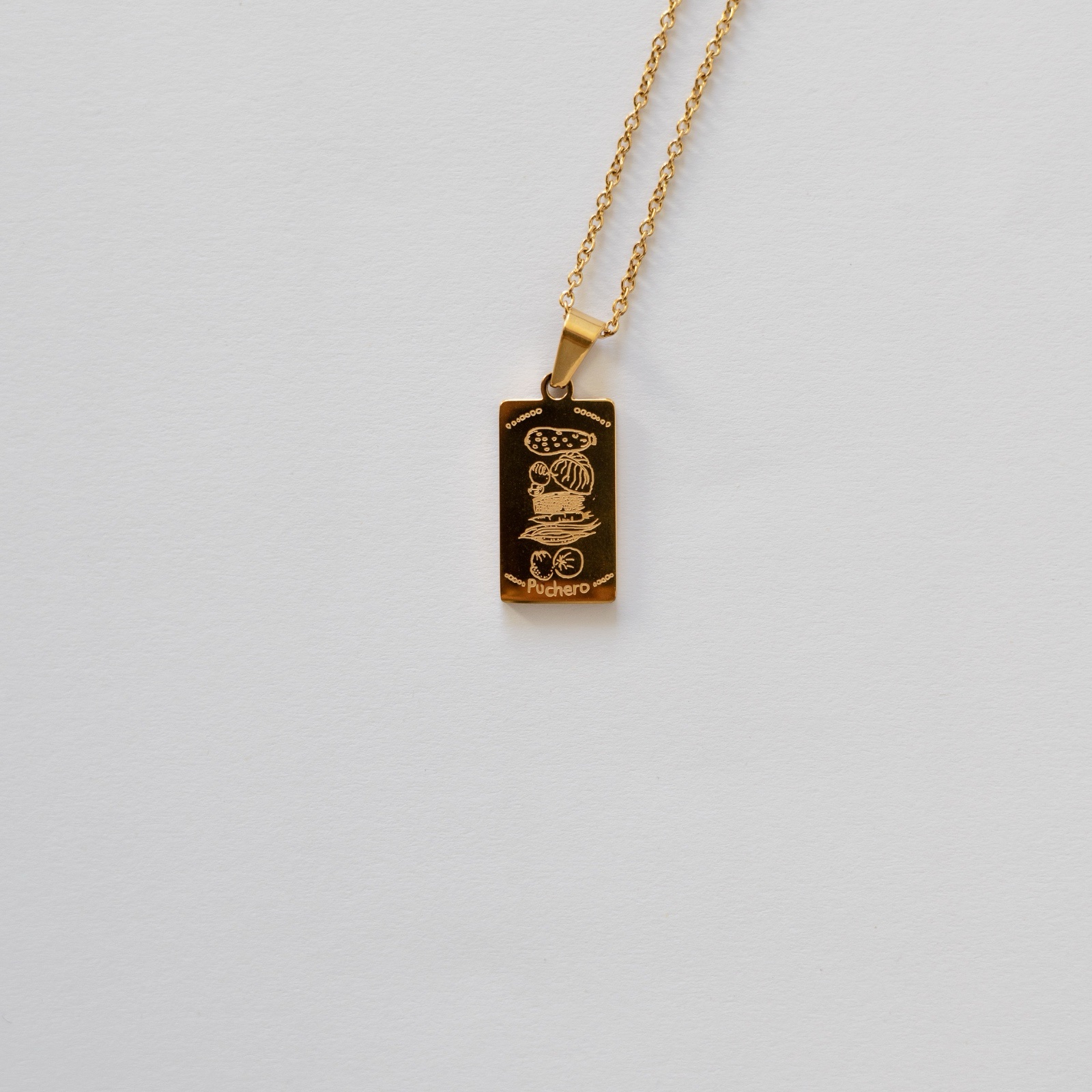 Cadena de 40cm de acero inoxidable, con chapa grabada con los ingredientes del Puchero Canario.