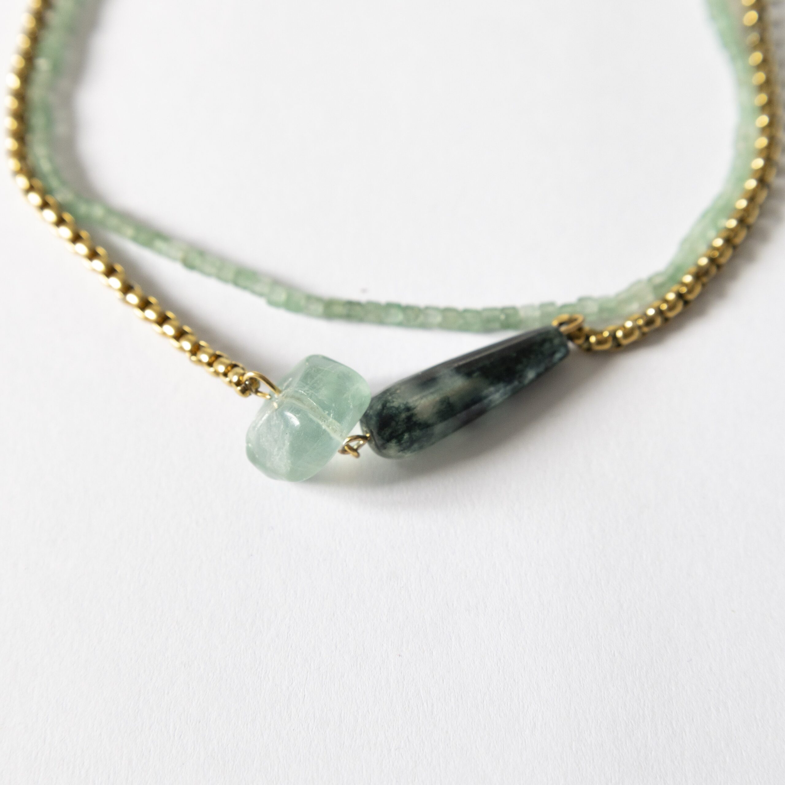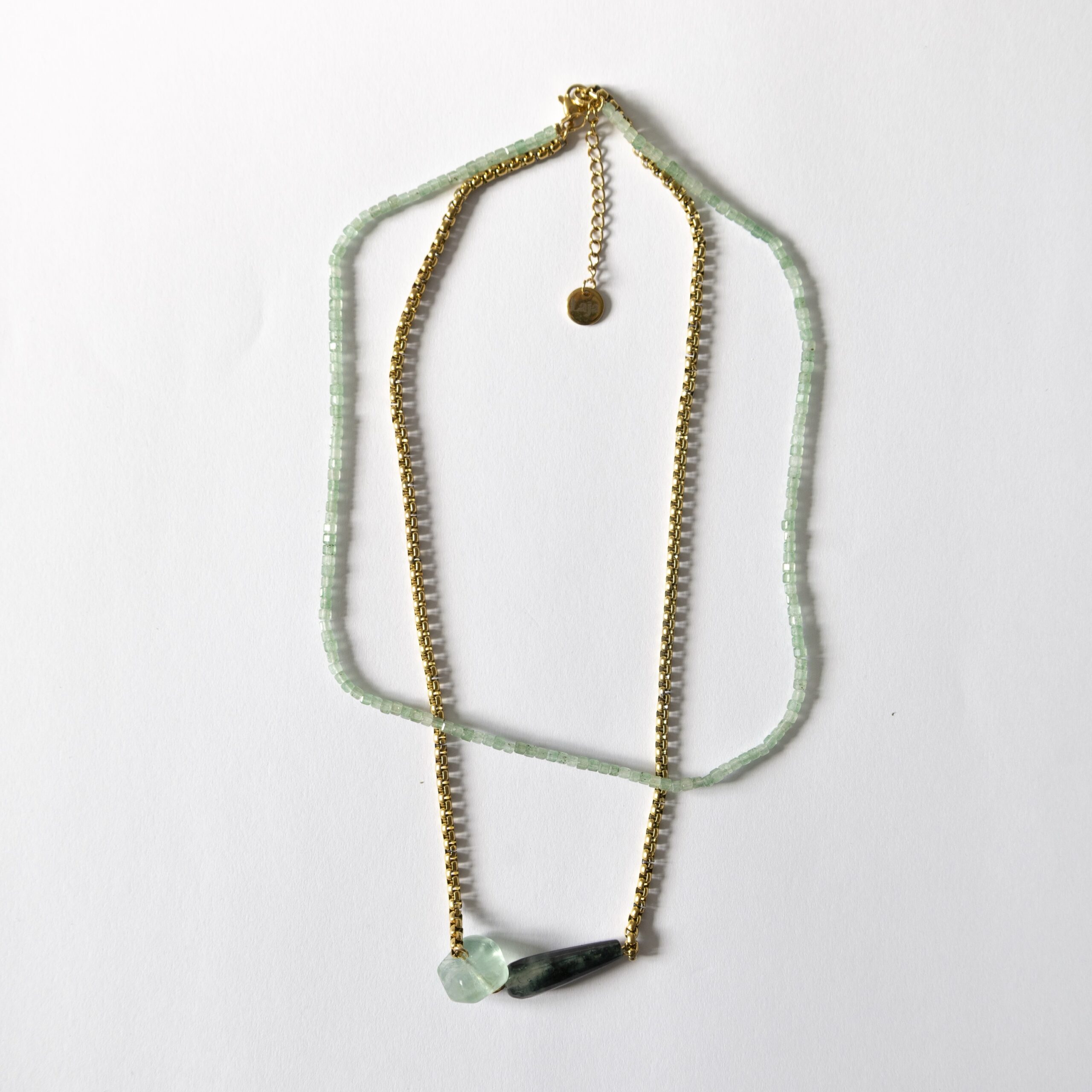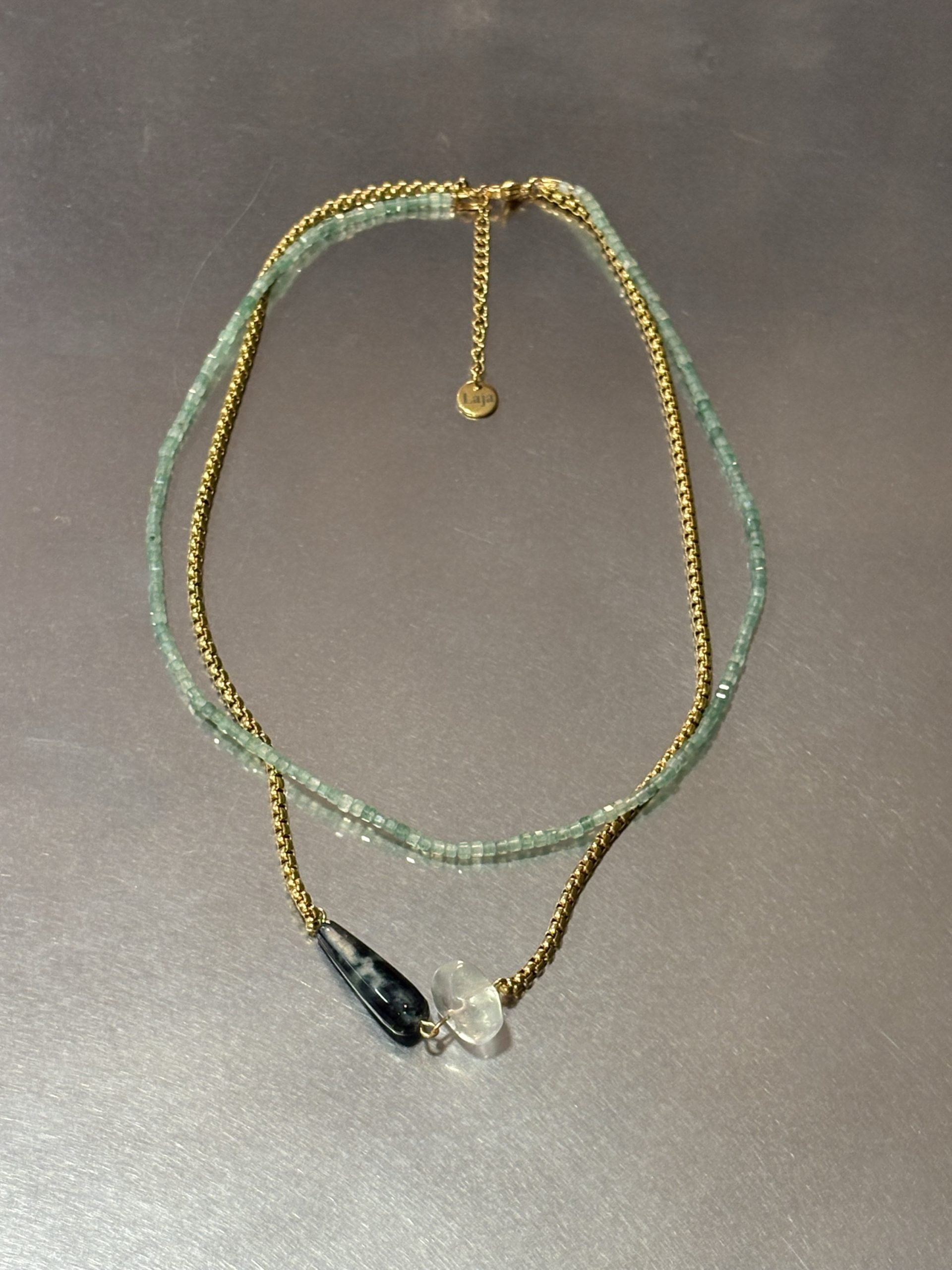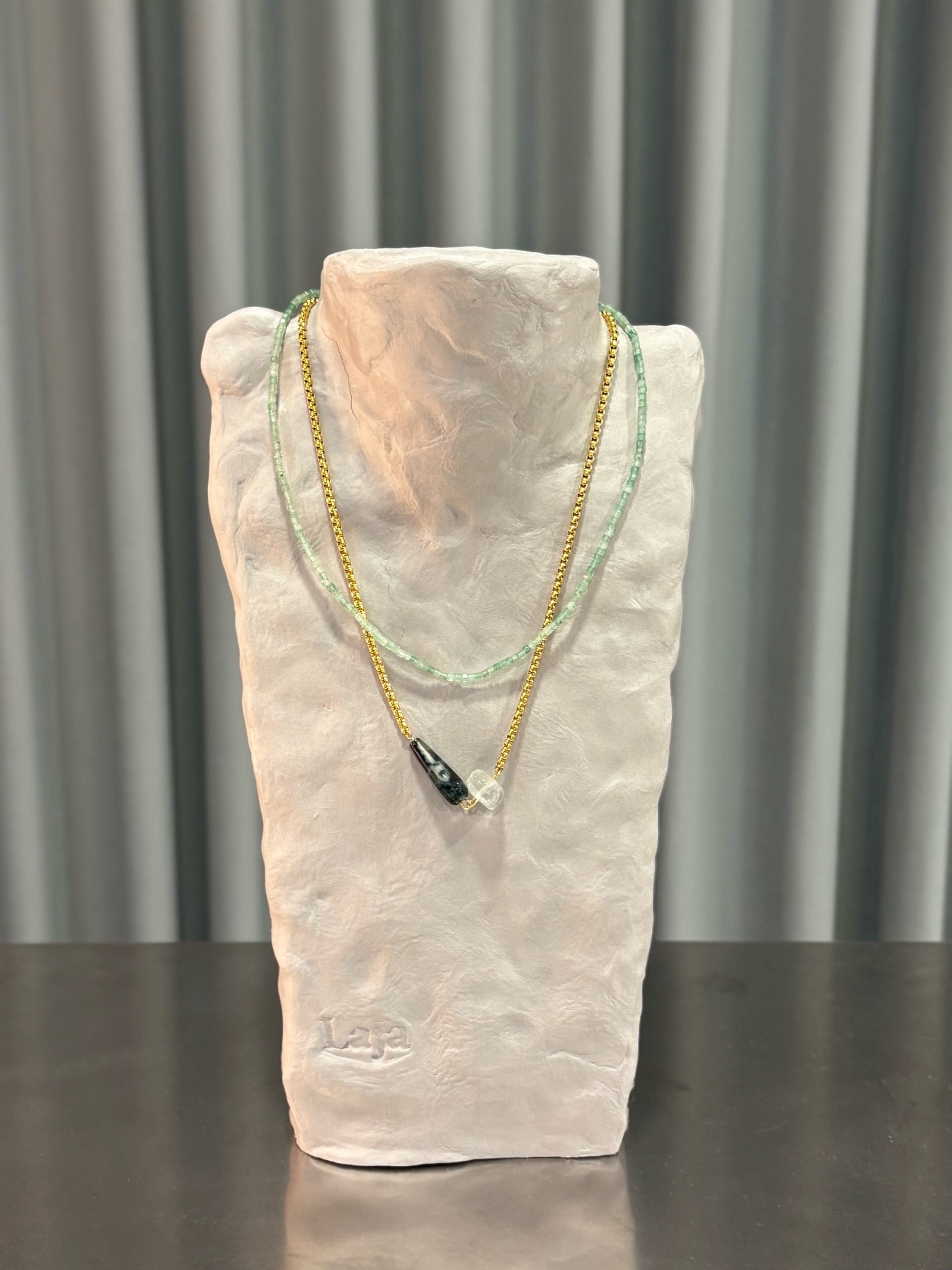 Collar de 40 cm compuesto por perlas, piedras naturales y cadena con cierre de acero inoxidable.