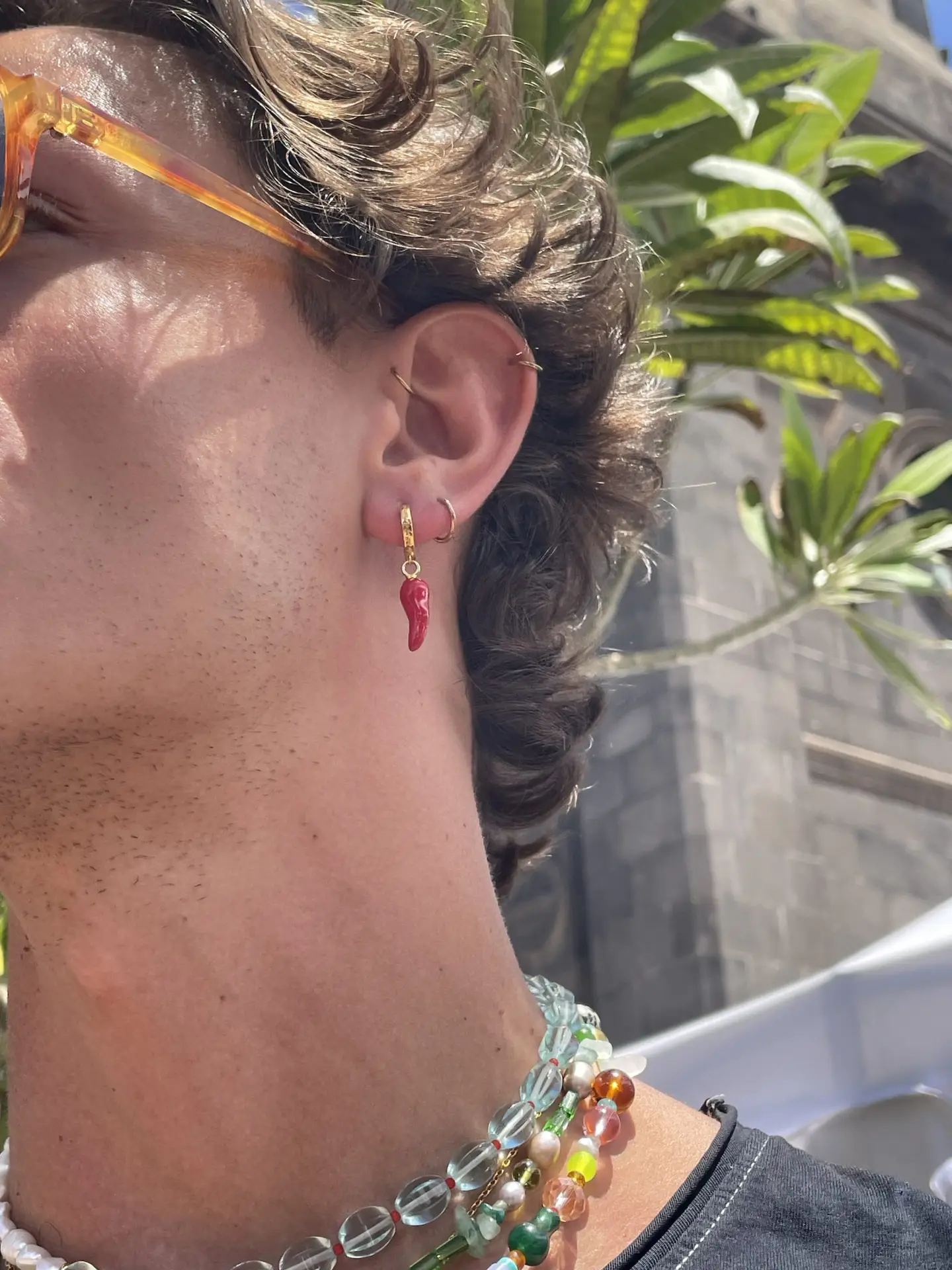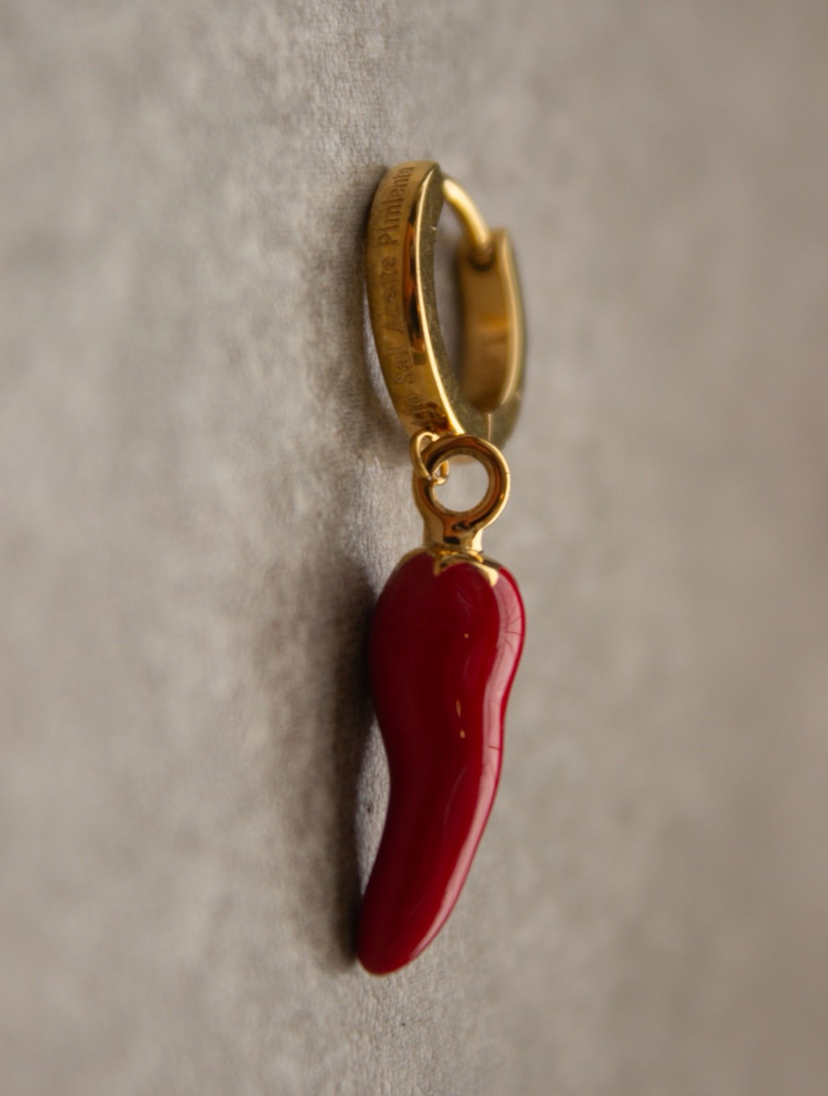Pendiente de acero inoxidable grabado con la receta del mojo canario y colgante en forma de pimienta roja. Disponible en color dorado y plateado. Precio por unidad.