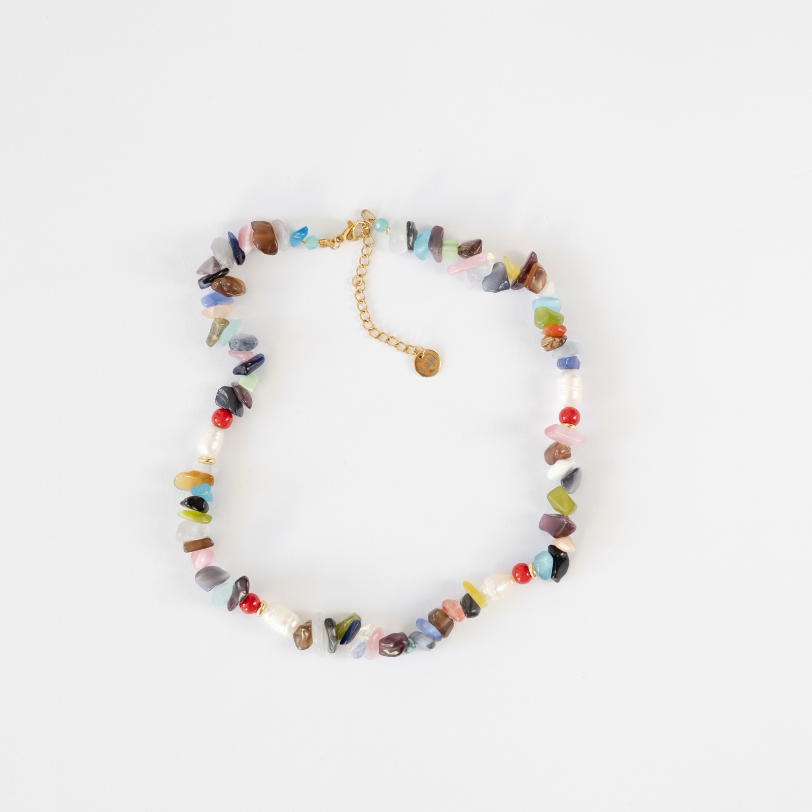 Collar de 39cm aprox con un alargador de 7cm, hecho a base de piedras y perlas naturales, los metales que lleva son de acero inoxidable.