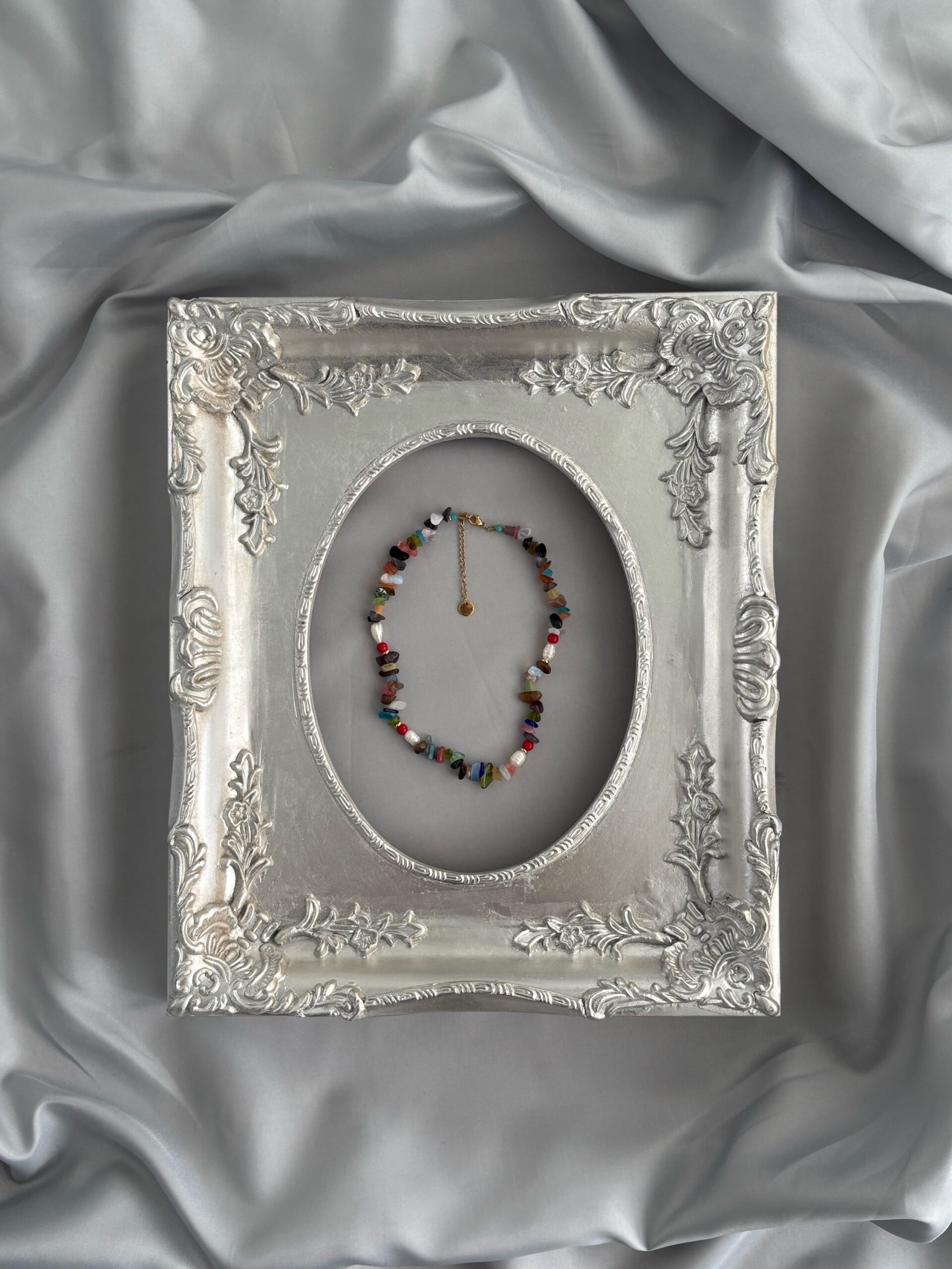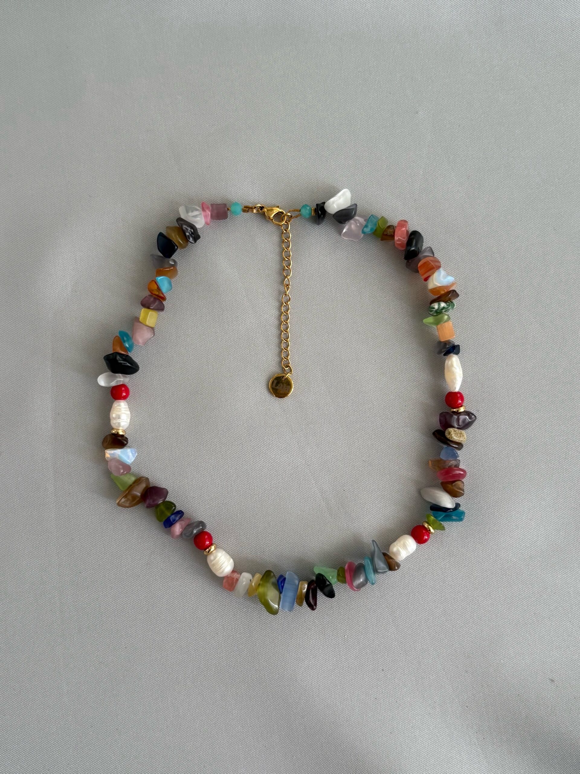 Collar de 39cm aprox con un alargador de 7cm, hecho a base de piedras y perlas naturales, los metales que lleva son de acero inoxidable.