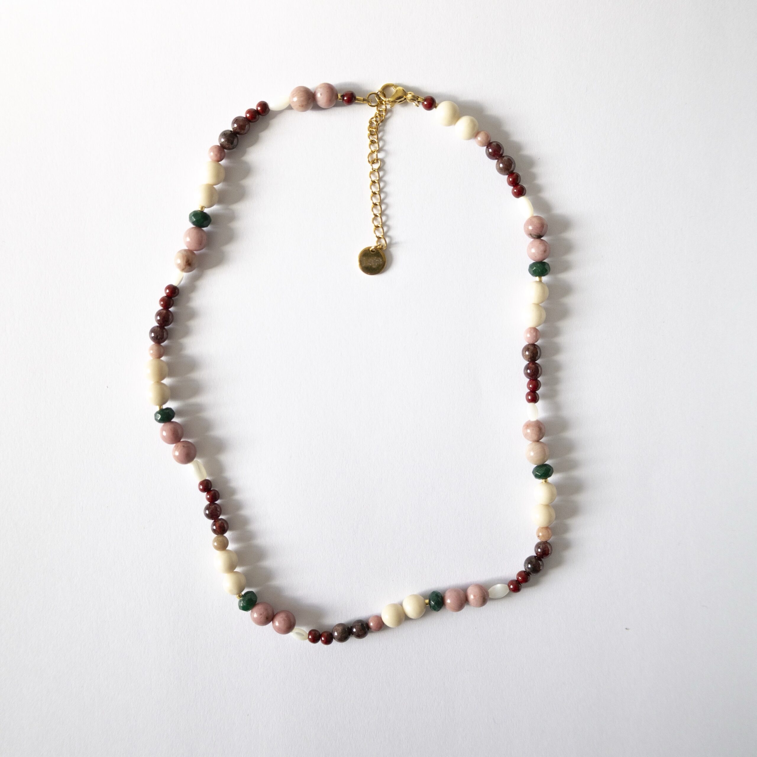 Collar Alhelí, diferentes piedras naturales y cierre de acero inoxidable. Mide 40cm aprox y tiene un alargador de 7cm que permite poder ajustarlo.