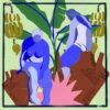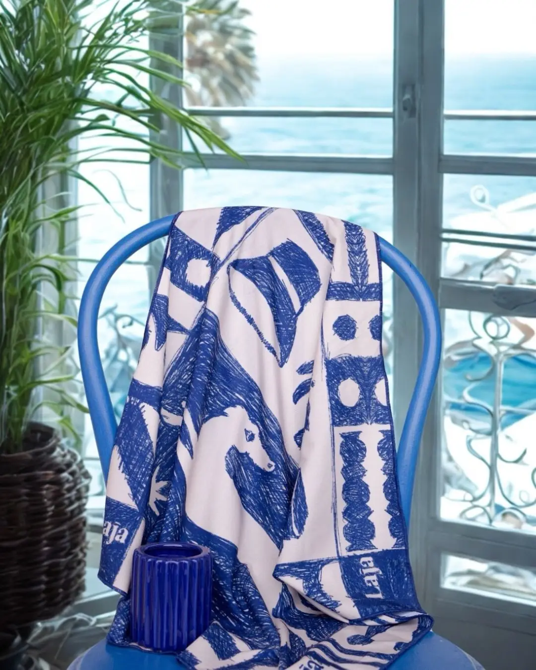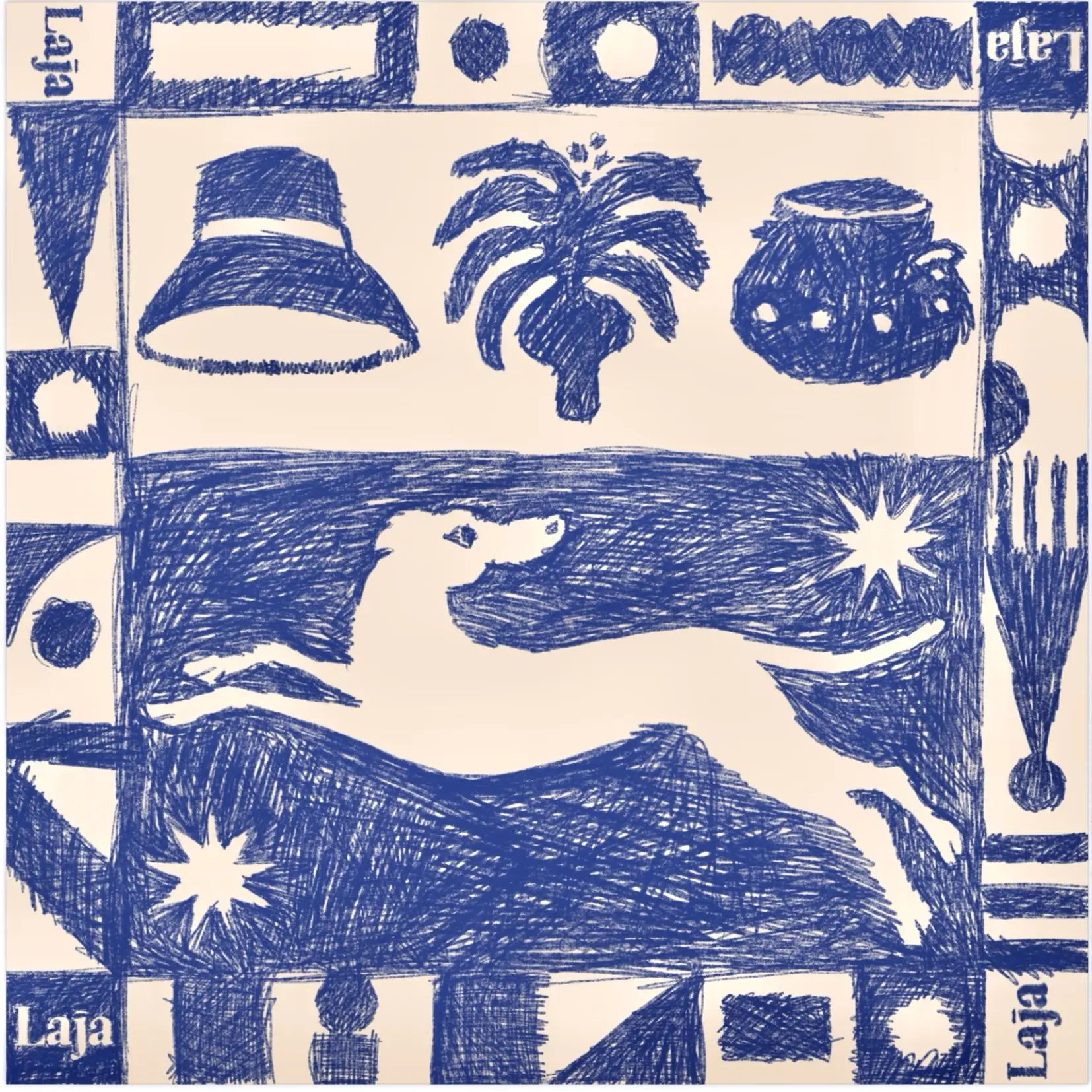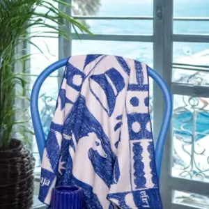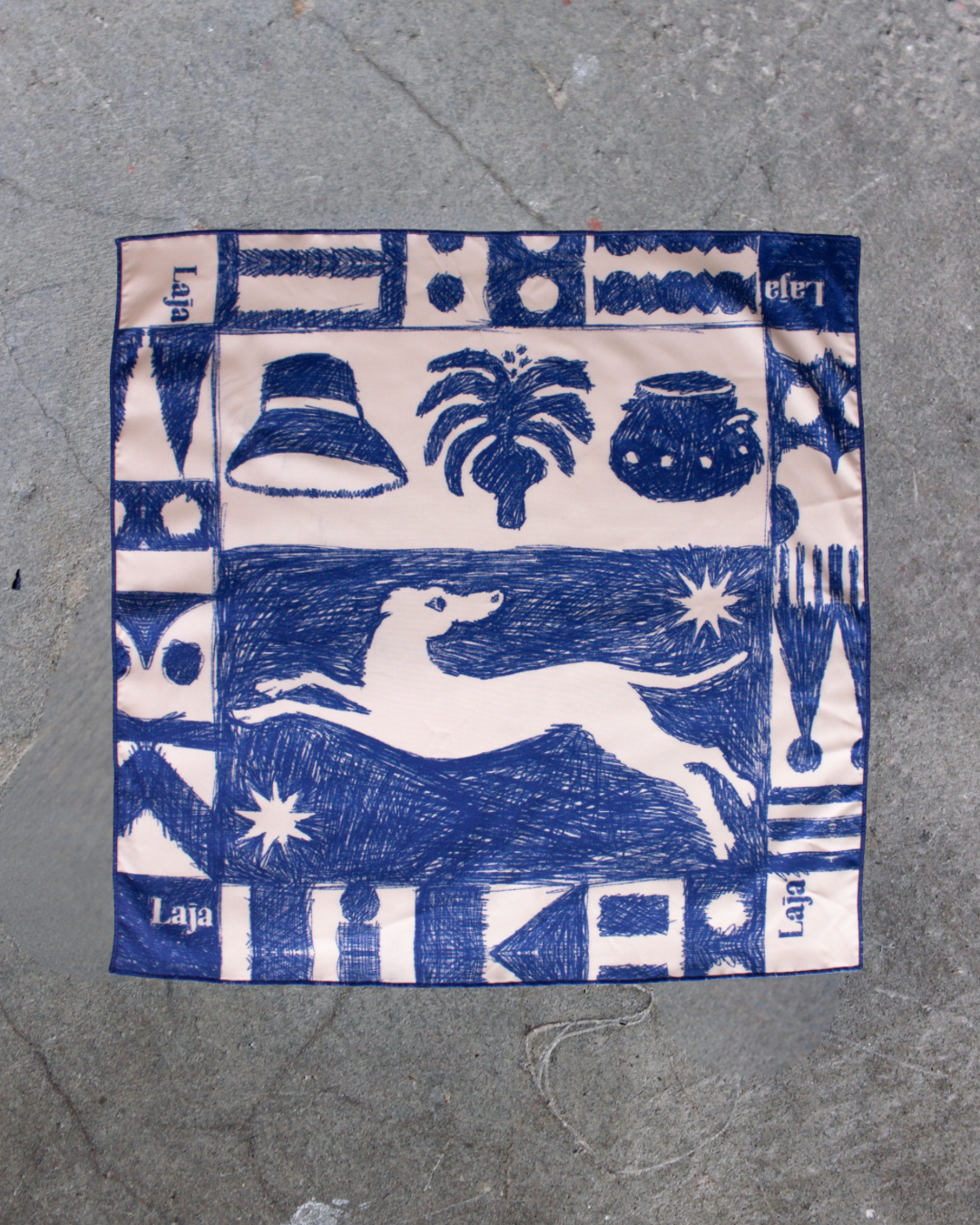PaƱuelo 60x60cm con remate en hilo azul diseƱo pintado a mano digitalmente con elementos Canarios